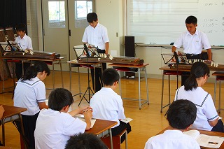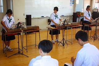 1年音楽では、和楽器の学習として琴で「さくら」を演奏します。今日は6組が練習の成果を発表し、琴の美しい音色が音楽室に響いていました。