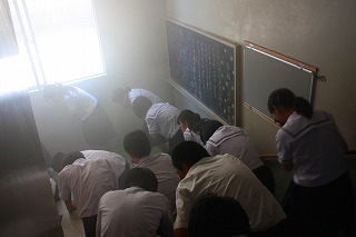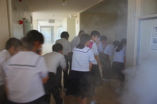 7月17日(火)4限、能美市消防本部の協力により、煙の発生している中で避難する訓練を行いました。生徒たちは煙の怖さを体感しながら、ハンカチで口を覆い、低い姿勢をとるなど、真剣に取り組んでいました。