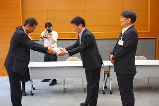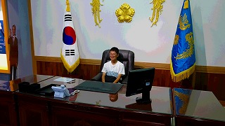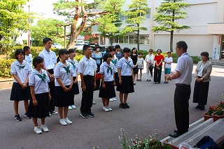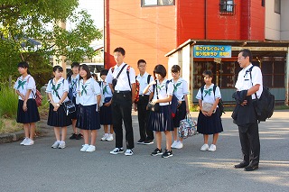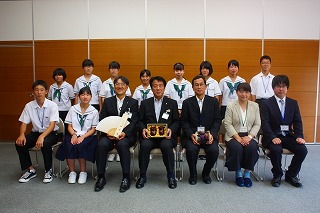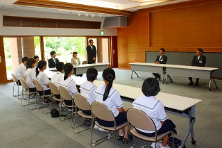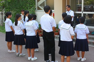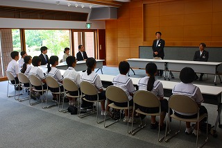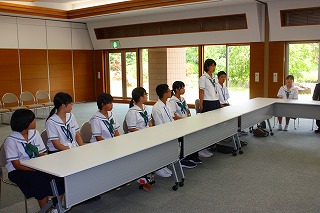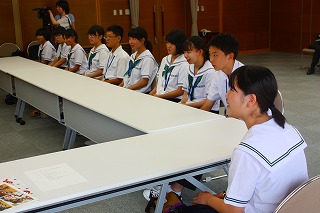7月27日(金)、小松空港へ到着した訪問団一行は、井出市長と谷口教育長に帰国報告を行いました。引率教師に続いて団員一人一人が訪韓の感想を述べた後、市長・教育長へ大德中から預かってきたお土産を渡しました。帰校後、解散式を行い、全日程を無事終了することができました。