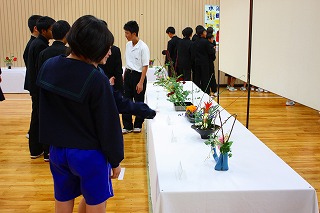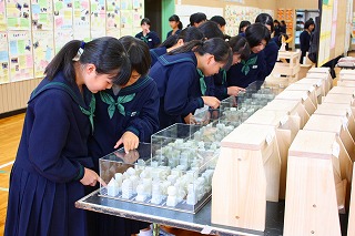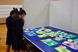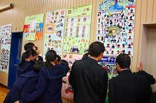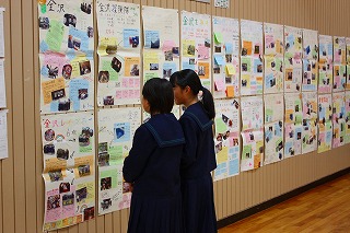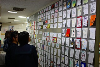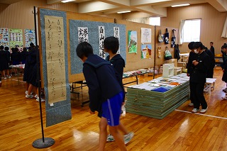 10月31日(水)昼休み、文化祭の作品展示が始まり、たくさんの生徒でにぎわいました。会場の格技室には、授業や部活動の作品、各学年の壁新聞などが展示されています。1日(木)、2日(金)の学校公開(文化祭)でもご覧いただけますので、保護者や地域の皆様のご来場をお待ちしています。