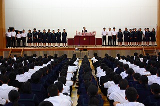 10月2日(火)放課後、文化祭演劇の結団式を行いました。演劇は、生徒の主体性や協力する力を育てるために、新たに取り入れた活動です。体育祭の成功を文化祭に繋げようと、キャスト・スタッフ合わせて約60名の生徒が集まってくれました。