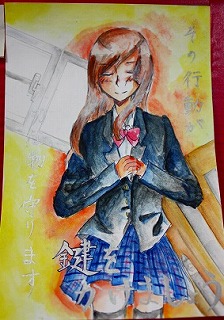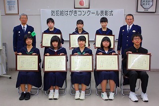 10月11日(木)夕方、寺井警察署で「防犯絵はがきコンクール」の表彰式が行われ、最優秀賞の吉光さんと、入賞の石沢さんが吉田署長より表彰状を受け取りました。受賞作品をはじめ寺井中2年生の作品など約400点余りの作品は、10月19日(金)まで寺井警察署1階に展示されています。