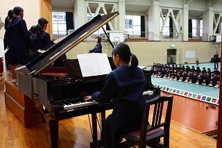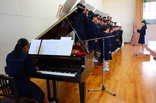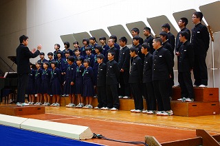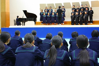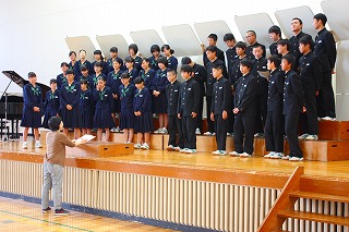 体育祭で同じ団同志の1~3年で、合同練習を行っています。お互いの合唱を聞いた後、感想やアドバイスを交流することで、合唱コンクール本番に向け、さらにレベルアップを図ります。