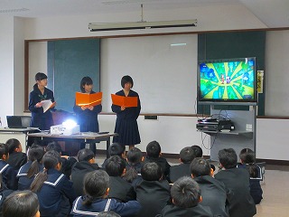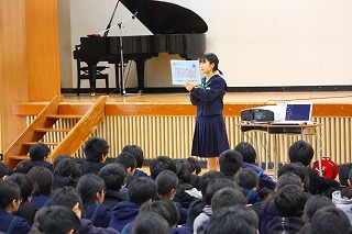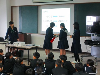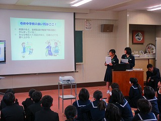 2月14日(木)午後、生徒会役員が寺井・粟生・湯野の3小学校に分かれ、6年生を対象とした中学校説明会を行いました。自分たちで考えた英語クイズなどを楽しんだ後、中学校の勉強や部活動、学校生活などについてわかりやすく説明し、児童からの質問に答えていました。