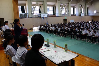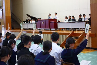 5月22日(水)6限、今年度の生徒総会を開催し、活動方針や予算について、活発な討議が行われました。また、総会後には、25日(土)に物見山陸上競技場で開催される能美中学校陸上競技大会の激励会を行いました。