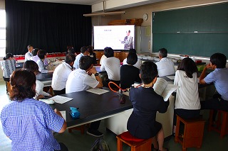 5月30日(木)放課後、道徳の評価について校内研修会を開催しました。本年度より教科化された道徳では、通知表等において文章による評価が行われます。今回は道徳推進教師が講師を務め、生徒の学びの姿を見とり、成長を願う評価となるよう研修を深めました。