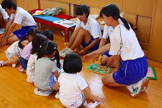3年家庭科では今年も市内保育園で保育実習を行っています。生徒が手作りのおもちゃを持って訪問し、園児と積極的に関わりながら、楽しく保育について学んでいます。園児たちも、中学生のお兄ちゃんやお姉ちゃんと遊ぶことができ、みんなキラキラの笑顔です。