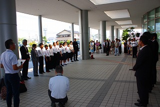 7月24日(水)午前、根上学習センター前にて、訪ロ少年親善使節団出発式が行われました。使節団員(生徒9名・引率4名)は、井出市長をはじめ市・学校関係者や保護者の皆様に見送られ、ロシアのシェレホフ市に向けて元気に出発しました。寺井中からは2名が参加し、帰国は7月30日(火)の予定です。