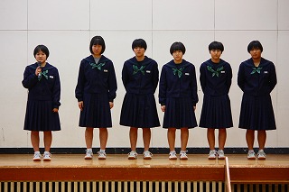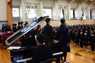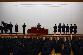 1月8日(水)1限、始業式の表彰伝達では、JOC石川県選抜チームとして全国優勝を果たした6名の女子ハンドボール部員が紹介されました。また、校長先生のお話の後、新しいALTのチャ・ミーさんも挨拶をしました。最後は、生徒会新役員がリードし、全校による校歌斉唱で式を閉じ、3学期がスタートしました。