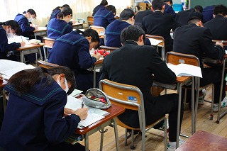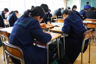 1月8日(水)、3年生は1月31日(金)に行われる私立高校入試に向け、受験校ごとに分かれ願書を清書しました。教室内には、いよいよ始まる受験本番への緊張感が漂っていました。3年生の健闘を心より祈っています。