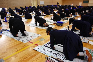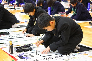 1月8日(水)2・3限、1年生は書き初め大会を体育館で行いました。凛とした空気と緊張感の中、真剣に筆を走らせている姿が印象的でした。