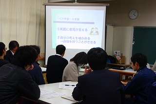 1月27日(月)放課後、研究主任の大路教諭が講師となり、SUS(若手教員向け研修会)を開催しました。問い返しや思考をゆさぶる発問と生徒の的確な見取りにより、効果的なグループ学習をコーディネートする手立てについて学ぶことができました。