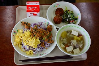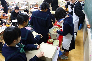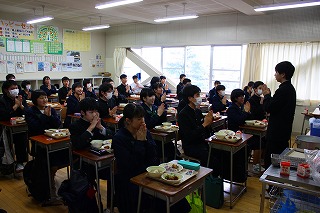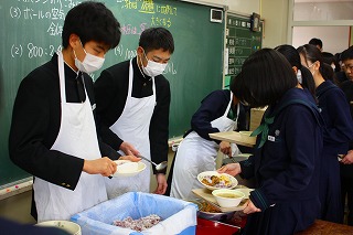 1月30日(木)の給食は、丸いもコロッケやゆずの酢の物を全校生徒で味わいました。給食週間の今週は、県学校給食献立コンクールで努力賞を受賞した2名の生徒の献立や、金沢・能登のメニューを楽しみ、地元食材や郷土料理の素晴らしさを感じることができました。