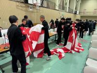 つづいて、明日から福島県で行われる「春の全国中学生ハンドボール選手権大会」に石川県代表として出場する男子ハンドボール部を全校で激励しました。キャプテンからは、試合への意気込みを話してもらいました。