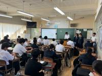 職場体験報告として、体験したことやそこから学んだことについて発表しました。2年生らしい気づきや落ち着いた発表がさすがでした。