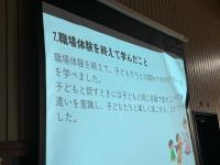 職場ごとに6つのグループに分かれた生徒は、それぞれのグループで、体験の内容や仕事の魅力、職場体験を終えて学んだこと、などについてプレゼンソフトを使って報告しました。