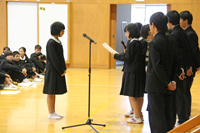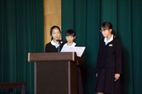 第二部では、全校平和集会を開きました。はじめに、3年代議員で構成する実行委員会から、修学旅行の広島で見聞きし感じたことを、生徒の感想文も交えながら、スライドを使い、原爆の被害の大きさ、平和の尊さ全校生徒に訴えかけました。