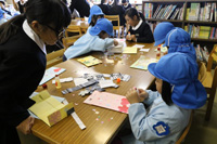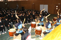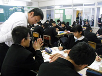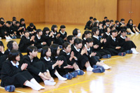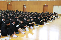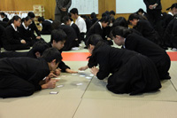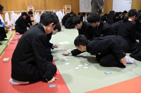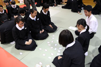 1年生の国語授業の一環として、昨年度よりクラス対抗百人一首大会を行っています。1月9日、武道場の畳の上で、各クラス総当たり戦で取った札の枚数を競いました。歌が詠まれるときに、覚えた歌が出るかという緊張と集中して耳を傾ける静寂に対して、札を取れたときの喜びや驚きがありました。学級みんなが大変楽しく交流することができた時間となりました。