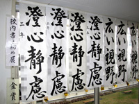 冬休みの宿題だった書き初めを各クラスで展示しました。どの書き初めも、冬休み中にじっくりと演習しただけのことはあり、力作揃いでした。その中から校内審査をして、入選作品を決めました。金賞、銀賞の入選作品は、校長室前廊下に掲示してあります。