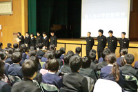 大聖寺警察署生活安全課の署員をお招きし、薬物乱用防止講座を開きました。薬物とは、麻薬や危険ドラッグばかりでなく、お酒やたばこも含まれます。未成年の内に、酒やたばこを常習にしていると、薬物に対する危機感が薄れ、もっと刺激の強い薬物に手を出していくようになるというお話をお聞きしました。特に脳に与える影響は顕著で、麻薬などでは脳細胞が解けて、二度と元に戻ることがないそうです。その最初の入り口がゲートウエイと言われるもので、歯止めともなります。中学3年生は、未成年でありながら、たばこやお酒に興味を持つ年頃であり、正しい知識と、薬物に手を染めない堅い決心が必要です。保護者の皆様も日頃より、言い聞かせていただきたいと思います。