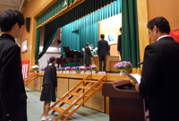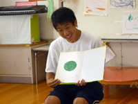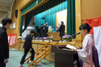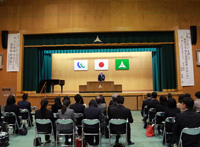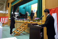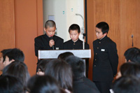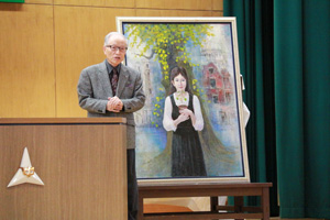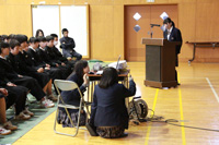 全校集会の場で、長谷川清先生から、「平和への祈り」(60号)の絵画を贈呈して頂きました。先生からは、この絵を東和中学校に送ろうと思い立ったいきさつをお話して頂きました。「平和への祈り」は、広島市で被爆したイチョウの2世を題材に描かれています。苗木を世界中に寄贈している広島市の任意団体「グリーン・レガシー・ヒロシマ・イニシアチブ」から苗木を譲り受け、苗木の存在を絵でも残そうと油彩画の制作をはじめたそうです。子どもたちに、この絵を見るたびに、平和の尊さを思い出してほしいと呼びかけて下さいました。