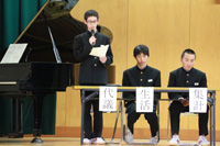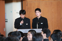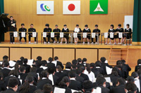 後期生徒会役員立候補者が定員の10名ちょうどであったため、当選が確定し、所信表明演説会を行いました。各役員の生徒達は、「もっと良い学校にしたい」、「挨拶をよくしたい」、「自分ひとりでは変えられないので力を貸してほしい」、「ボランティアに協力してほしい」など、立候補した理由を表明し、全校生徒に訴えていました。堂々とした立派な所信表明演説会になったと思います。後期は文化祭という大きな行事がありますが、各委員会の日々の活動をしっかり行ったうえで、文化祭の成功を期待しています。