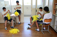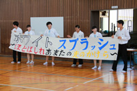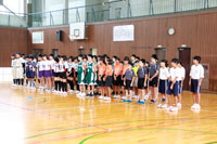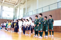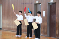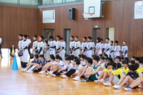 3年生が応援団を結成し、多少緊張している1,2年生を勇気づけようと、体育祭に一緒にがんばってくれた感謝を込めて、とても大きな声と振り付けで激励しました。各部の部長は、大会に臨む思いを堂々と述べることができ、強い意気込み感じました。大会本番では、①失敗を恐れず、攻めの姿勢で思いっきりプレーをすることと、②大きな声を掛け合い、選手も控え選手も声を一丸となって試合をしてきてほしいと激励をしました。