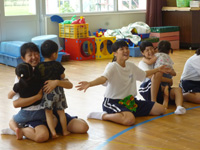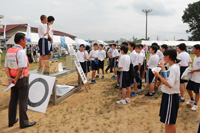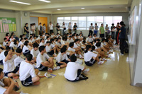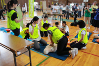 子どもたちは、消防署員の説明をしっかりと聞き、胸骨圧迫やAEDの使い方を体験しました。
