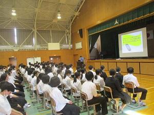 本日、全校生徒を対象に、大聖寺警察署の警察官をお招きし、防犯教室を開催しました。内容は、インターネットのトラブルについてです。