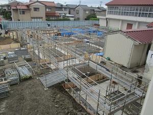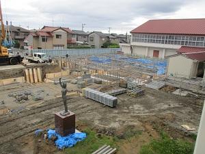 一旦更地にした後、基礎のための穴が掘られ、その上に櫓が建てられました。毎日見ていると、その変化に驚くとともに工事の方法を知ることができるので、大変勉強になります。生徒も我々教師も、興味を持って見つめています。櫓が建つと、何となく校舎の形が見えてきて、ワクワク感が増します。どんな東和中学校になるのでしょう?