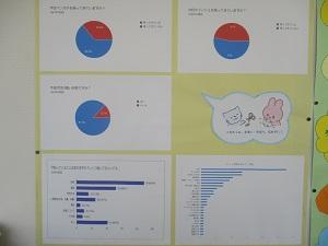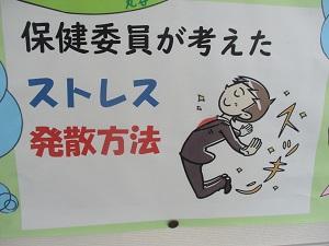 職員室前の掲示板に、生徒会保健員会が作成した「ストレス発散方法」のポスターが掲示されています。保健委員の生徒一人一人のストレス発散方法が書かれています。「寝る」や「スポーツをする」「好きなことをする」が多いようです。「映画を見る」「音楽を聴く」「相談する」などもありました。どれも、なるほどあるある・・と感じました。