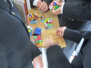 校長室の前の廊下には、いくつかのルービックキューブがおいてあります。昼休みになると、1年生が群がって挑戦しています。簡単にはできないから面白いんですね。試行錯誤を繰り返し、いつか自分の力で6面完成できたらいいですね。