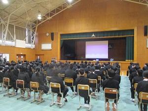 本日、1年生を対象に、大聖寺警察署から警察官を講師として招き、交通安全教室を実施しました。講師の先生からは、自転車乗車時のヘルメットの重要性や雨天時に注意すること、また、自転車乗車時の横断歩道の渡り方などについて、説明がありました。