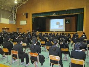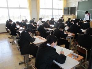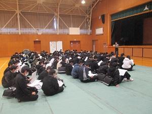 明日はいよいよ公立高校入試です。今日は、3年生を対象に、明日に向けての心構えと準備のための学年集会を開きました。講堂に集まった3年生は、緊張感の中にも、引き締まった表情をしていました。進路担当や学年の先生の話を、うなずきながら聞いていました。
