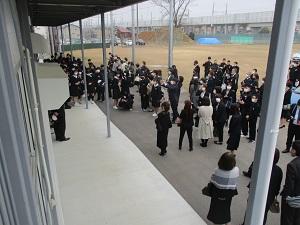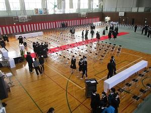 今日初めて、全校生徒が式場に集まり、卒業式の練習をしました。通し練習の後、校歌の練習をしましたが、すごく大きな声が出ていたのでびっくりしました。この1年、コロナ対策のため、十分に全校集会が開けず、校歌斉唱に不安がありました。しかし、3年生を中心に、思いのこもった素晴らしい声を響かせていました。明日の本番が楽しみです。