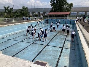 本日、プール掃除を行いました。昨年度は、コロナの影響でプールの利用を中止していたので、2年ぶりです。午前中から始めて、1日がかりで掃除しました。生徒達は、冷たい水に歓声を上げながら、ブラシを使って丁寧に磨き上げていました。