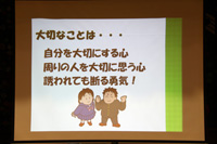 大人になってからも薬物に絶対に手を出さないために、甘い誘いにのらず、①自分を大切にする心、②周りの人を大切にする心、③誘われても断る勇気を持ってほしいと思います。