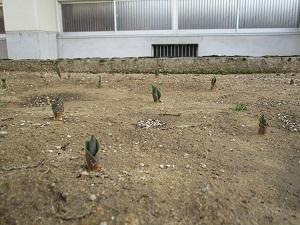 秋に生徒たちと植えたチューリップの球根が、ちょっとずつ芽を出してきています。春の息吹を感じます。入学式には間に合わないかもしれませんが、4月の中頃には奇麗な花で生徒を迎えられそうです。果たして赤・白・黄色、何色の花が咲くのかな・・?