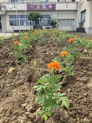 正面玄関前の花壇に、卓球部の皆さんの手でマリーゴールドが植えられました。