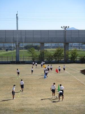 1年生の体育の授業は、サッカーでした。秋晴れの下、元気な声がグランドに響いていました。