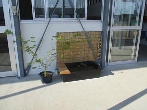 メダカ倶楽部が、仮設校舎の玄関前に引っ越しをしました。日当たりがよくなり、メダカさんも紅葉さんも、心なしかうれしそうです。人懐っこく育っていますので、本校に来校した際は、ぜひご覧ください。