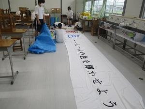 スローガンは「三原色 ~一人一人の色を輝かせよう~」です。全校生徒から募集し、生徒会が決めました。とても素敵なスローガンです。夏休中に、垂れ幕も作りました。下の写真から、さらに進化してカラフルになっています。本番が楽しみです。