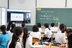 3年生の理科は、斜面上での台車の運動について学ぶ授業でした。斜面をつくり台車を走らせ、記録された紙テープのデータを分析するというものです。以前は、紙テープを切って糊で台紙に張り、それを分析するというアナログ的なまとめ方でした。今日の授業では、紙テープのデータをタブレットに入力し、作成されたグラフを分析するというものでした。生徒たちは、タブレットを使いこなし、考察やまとめを行っていました。アナログな実験をデジタルでまとめるというハイブリッドな授業で、なかなか楽しそうでした。