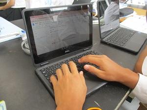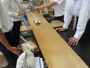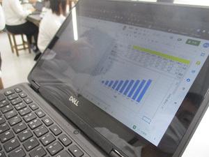 3年生の理科は、斜面上での台車の運動について学ぶ授業でした。斜面をつくり台車を走らせ、記録された紙テープのデータを分析するというものです。以前は、紙テープを切って糊で台紙に張り、それを分析するというアナログ的なまとめ方でした。今日の授業では、紙テープのデータをタブレットに入力し、作成されたグラフを分析するというものでした。生徒たちは、タブレットを使いこなし、考察やまとめを行っていました。アナログな実験をデジタルでまとめるというハイブリッドな授業で、なかなか楽しそうでした。