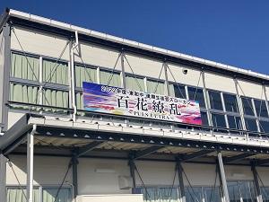 後期生徒会のスローガンである「百花繚乱」が、本校仮設校舎に設置されました。無機質な仮設校舎の外観が、ずいぶんと華やかになりました。前期のシックでシンプルなデザインもよかったですが、後期のスローガンに見合うカラフルなデザインも素敵です。
