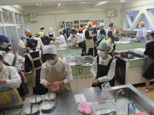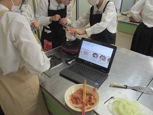 3年生の家庭科の授業では、調理実習を実施しました。コロナ禍で中止していた調理実習ですが、3年ぶりぐらいの実施です。生徒たちは、感染対策を十分に行ったうえで、タブレット上のレシピを見ながら、楽しそうに作っていました。3年生の笑顔を見ると、心から実習を楽しんでいるように見えました。生活と密接にかかわるこのような授業は、本当に大切だと思います。今日のメニューは豚生姜焼きだったのですが、校舎内に食欲を誘う匂いが漂っていました。生徒の皆さん、今度は自宅で作ってみてください。