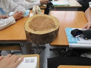 2年生技術科の授業では、木材の学習をしていました。材木屋さんからいただいた本物の切り株を使っての授業でした。切り株に触ったり匂いを嗅いだりしながら、木の感触を確かめていました。本物に触れるのはいいものですね。生徒たちは、興味深そうに切り株を眺めていました。この後、切り方によって板の曲がり方が変わるなど、木の特性を学んでいくことになります。今後の技術の授業が楽しみですね。