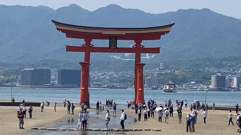 厳島神社は引き潮で、鳥居の近くまで歩いていくことができました。神社の荘厳な建物と宮島の雰囲気を感じながらの散策でした。