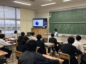 生徒会が、よりよい授業をめざしてアンケートを実施するとともに、スローガンを発表しました。アンケートでは、ほとんどの生徒が、今以上に真剣に取り組む授業を望んでいることがわかりました。また、生徒が主体的に考えたり、友達と協働して考えたりすることが楽しいと思う生徒が多いことがわかりました。(生徒会がリモートで報告会を実施)