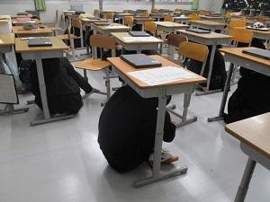 本日、今年度2回目の避難訓練を行いました。今回は地震に対する対応で、緊急地震速報が発生した際の動きについて確認しました。放送で緊急地震速報を流し、それとともに生徒は机の下に潜り込んで落下物から頭部を保護しました。